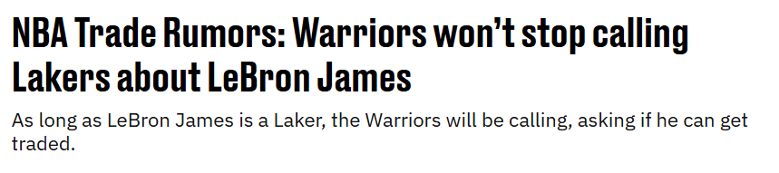 北京时间8月23日,据NBA名记Jake Fischer报道,在过去18个月,勇士已经多次尝试通过交易得到湖人球星詹姆斯。